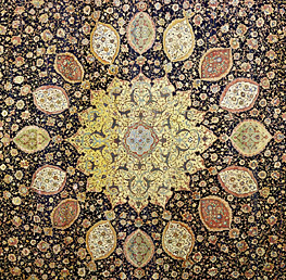 The Persian carpet reached its zenith during the reign of the Safavid Dynasty in the 16th century AD. Approximately 1500 examples are preserved in various museums and in private collections worldwide. During the reign of Shah Abbas (1587 - 1629), commerce and crafts prospered in Persia. Shah Abbas encouraged contacts and trade with Europe and transformed his new capital, Isfahan, into one of the most glorious cities of Persia. He also built workshops for carpets where skilled designers and craftsmen set to work to create splendid specimens. Most of these carpets were made of silk, with gold and silver threads adding even more embellishment. Two of the best know carpets of the Safavid period; dated 1539 come from the mosque of Ardabil. Many experts believe that these carpets represent the culmination of achievement in carpet design. The larger of the two carpets is now a centrepiece in London's Victoria and Albert Museum.